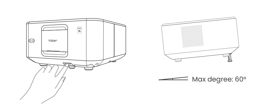 For optimal image quality, place the projector on a flat and stable surface. To adjust the vertical angle, use the adjustable foot pad at the bottom of the projector.