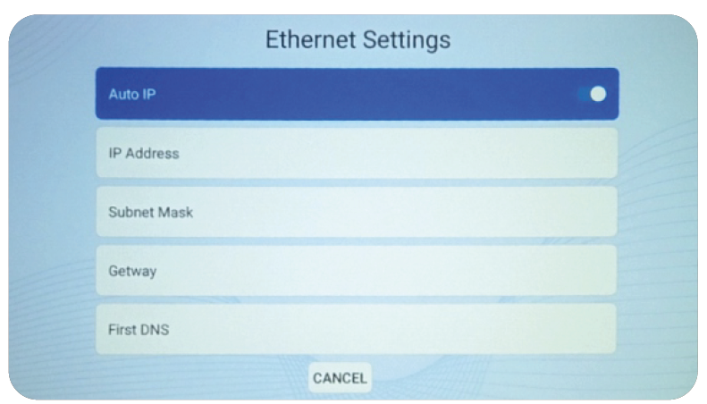 - Go to Homepage-> Setup> Network> Wired Setting> Ethernet Setting >Auto IP (On)