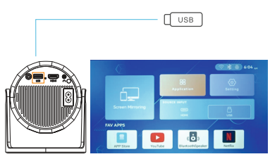 Plug the USB into the port present at the rear side of the projector. Now ZEBRONICS ZEB-PIXAPLAY 63 Smart LED Projector navigate to the USB tab present on the homepage.